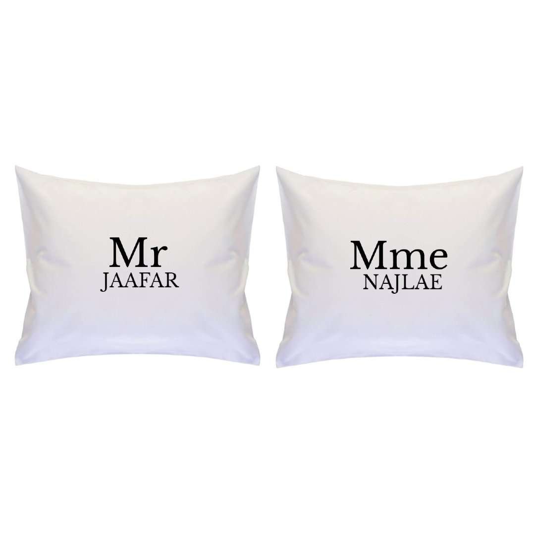Cet ensemble de housses de coussin Monsieur et Madame se compose de deux taies d’oreiller blanches composées de coton agréable et doux au toucher, super confortable. Vous choisissez vous-même la personnalisation qui sera parfaitement adaptée aux destinataires du cadeau avec leurs prénoms : une idée cadeau couple unique ! Nous nous occuperons d’imprimer votre création avec nos plus belles couleurs. N’attendez plus !